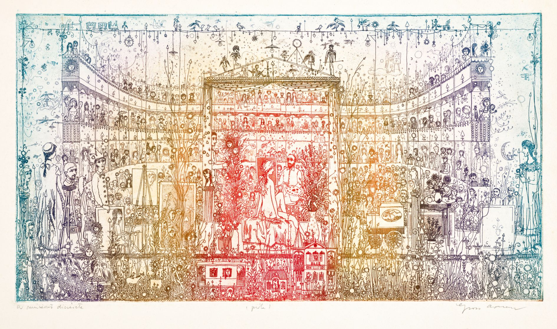 Jelezve balra lent: A művészet dicsérete, Jelezve középen lent: (Próba), Jelezve jobbra lent: Gross Arnold