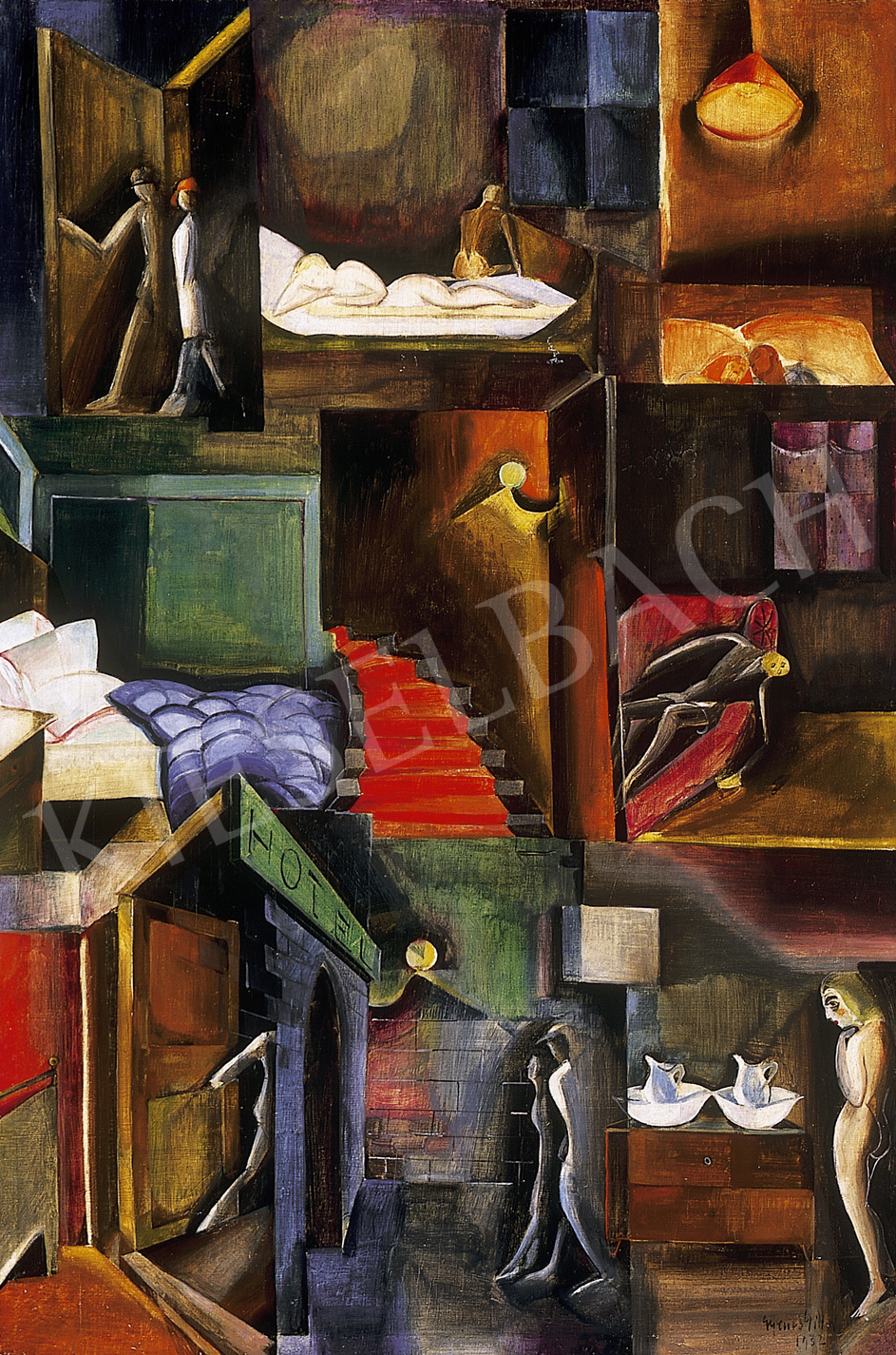 A két festmény montázsszerű metszetét adja egy-egy zugszállónak. A zegzugos kulisszaszerű tereket kanyargó lépcsők kötik össze, a szobákban különböző extrém eseményeket (öngyilkosságot, prostitúciót), illetve intim jeleneteket (anya szoptatja gyermekét, alvó házaspár) láthatunk egymásmellettiségükben. A helyzetek "állandósult ideiglenességét", bizonytalanságát fokozza a folyamatos mozgás, hiszen itt mindenki átmenőben van.