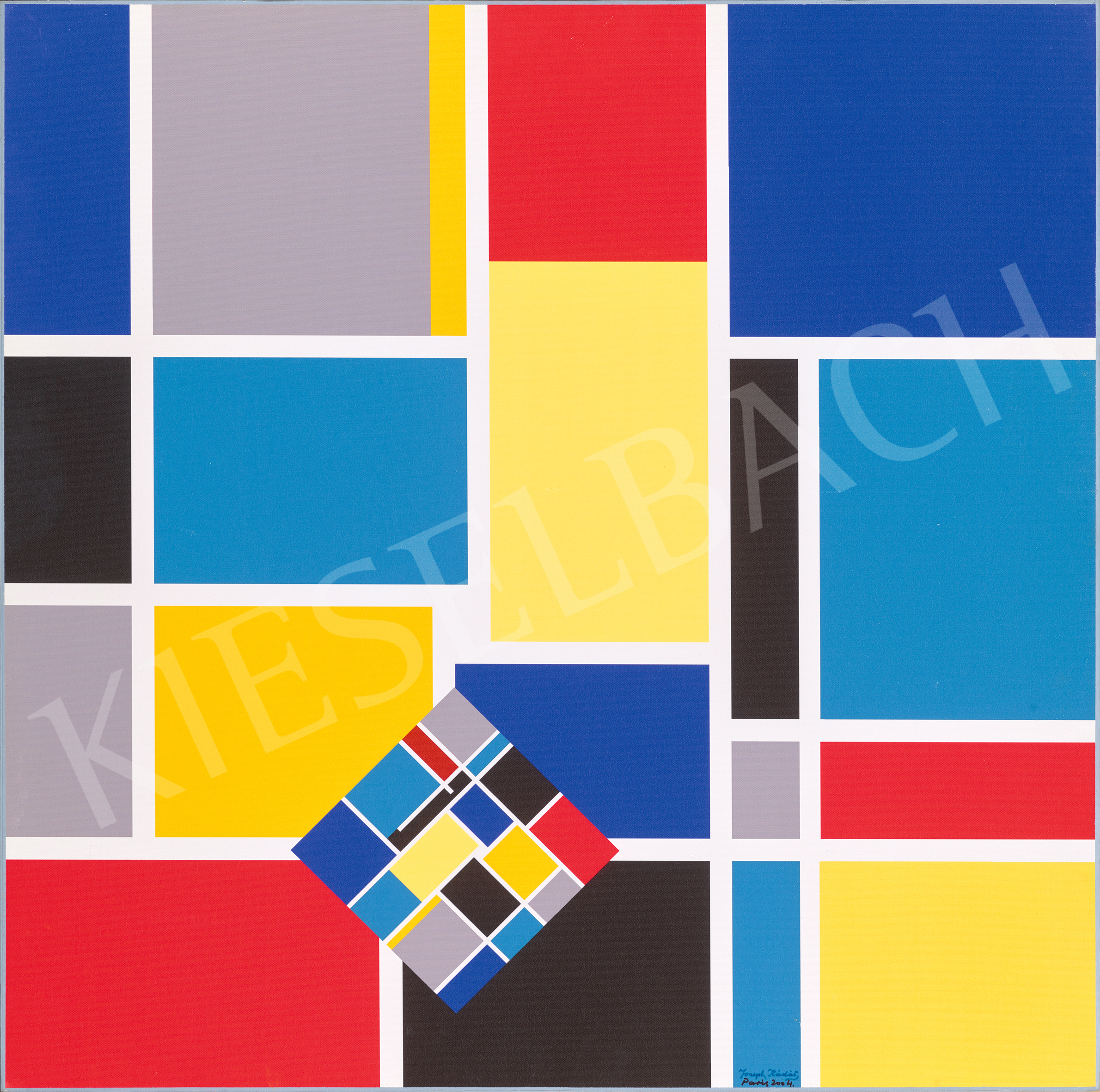 Hátoldalon autográf felirat: Le K’dar (Joseph Kádár) 1936-, Debrecen - Hongrie – Hommage á Mondrian Paris 2004, vászonon kasírozott akril, Exportion: Nemzetközi Modern Múzeum 4200 Hajdúszoboszló